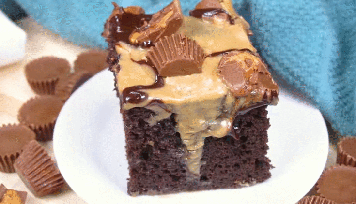 A rich and fudgy Slow Cooker Chocolate Peanut Butter Cake with a creamy peanut butter glaze and chopped peanut butter cups on top.